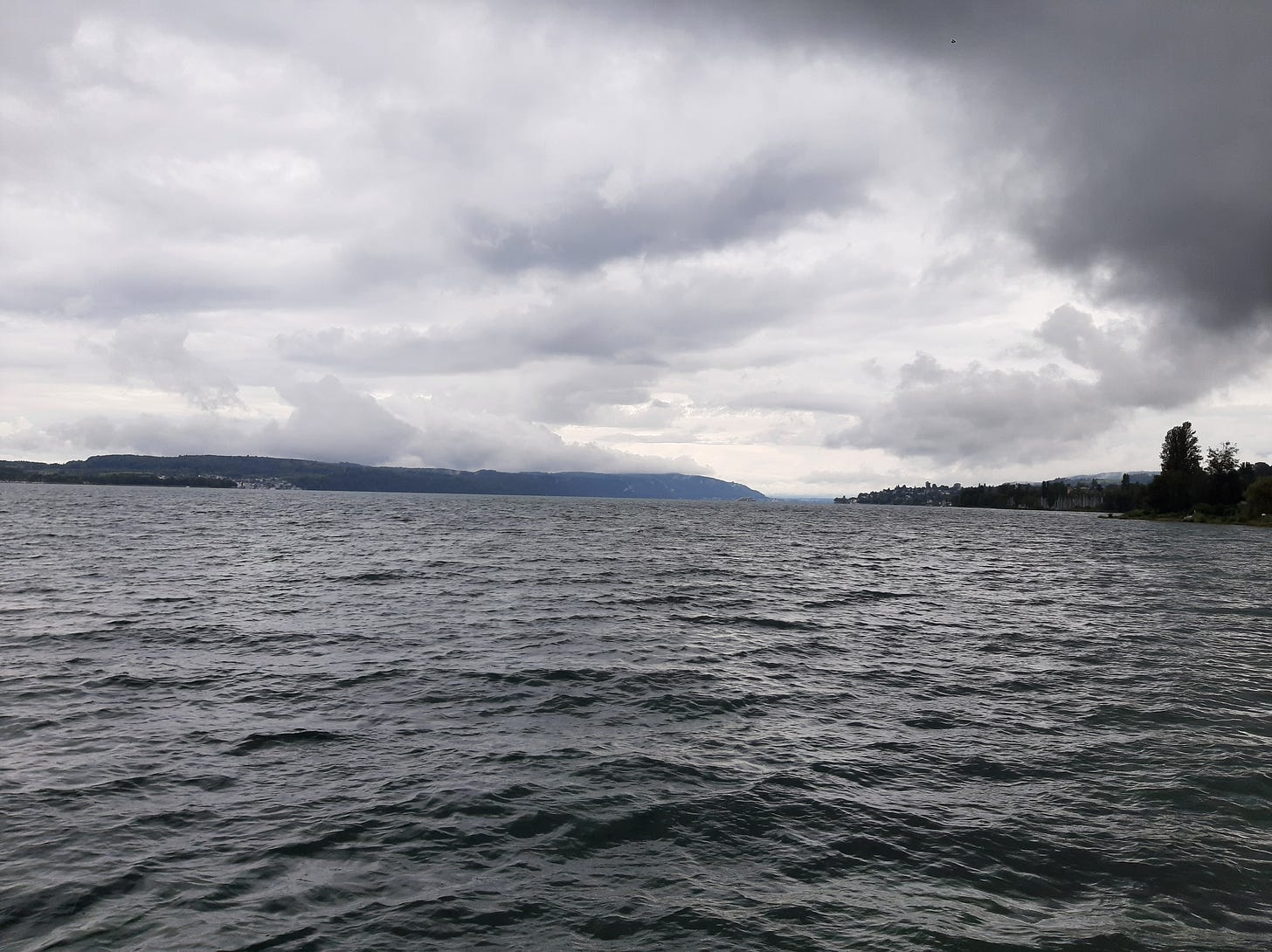 I swim on an overcast day, sky grey, the horizon blurred, a dark mountain range of vapour pushing across the lake. Single drops fall and as I float on my back in the clear, shimmering green, I can hear the sound of the raindrops hitting the water, accompanied by the shushing and swaying of silt and seagrass shifting below me in the soft current. I can pratically feel the tension being drawn out of my body and diffused in this great, gentle body of water. I stay until I start shivering.